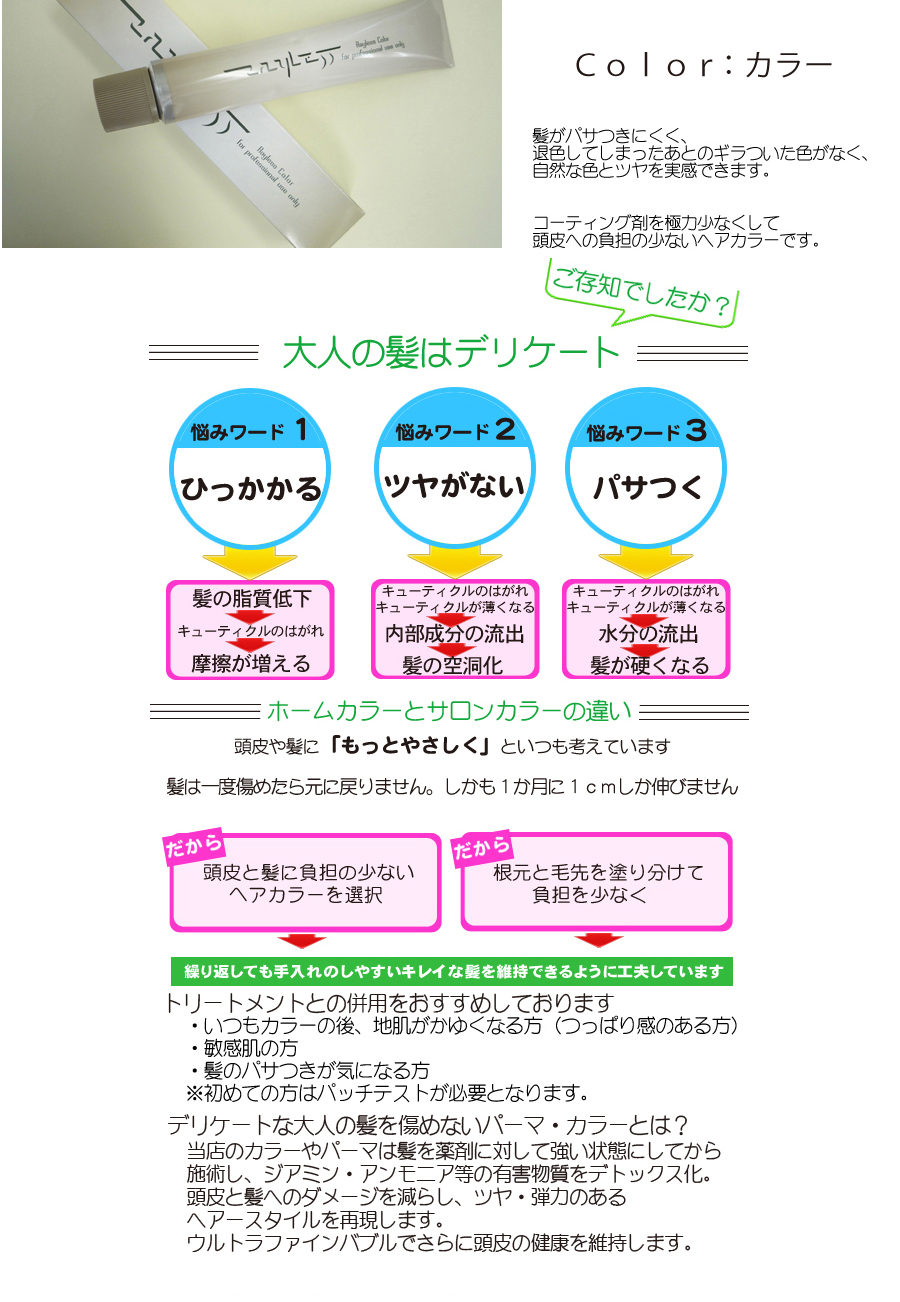 こだわりの技術と厳選した楽剤で、お客様の安心と美髪をお手伝い